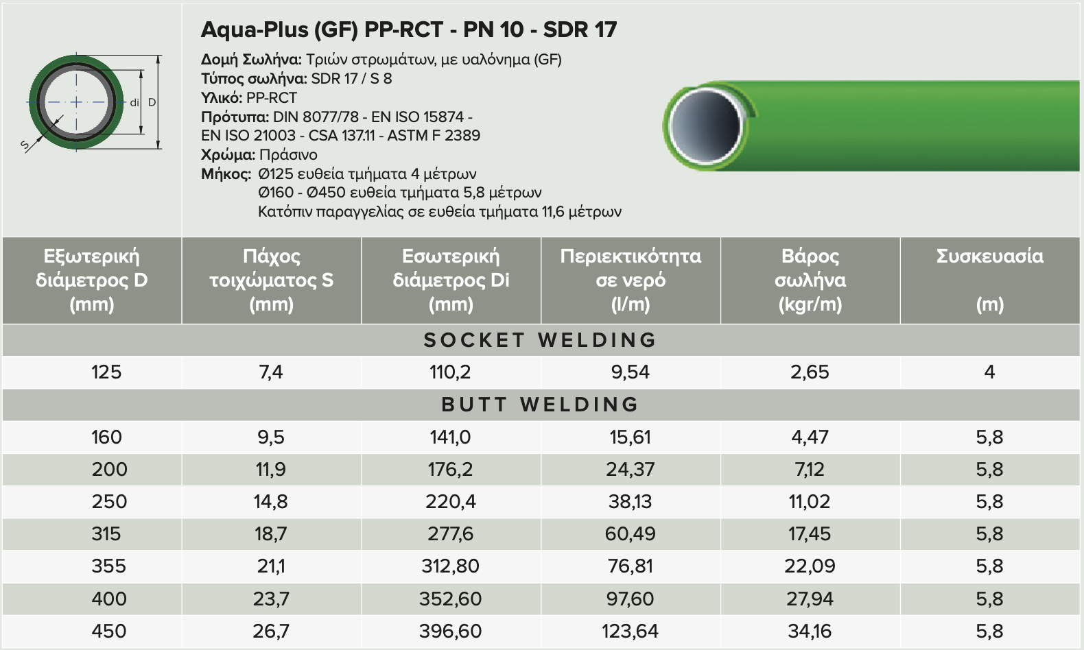 Οι σωληνώσεις από PP-RCT είναι πιστοποιημένοι για τις μηχανικές τους αντοχές από την Mirtec ΕΒΕΤΑΜ, ICC Αμερικής, IAPMO Αμερικής και για τα δίκτυα με πόσιμου νερού από το WRAS.Τα τρία στρώματα πρέπει να είναι από PP-RCT. Σωλήνες που μόνον το εσωτερικό στρώμα κατασκευάζεται από PP-RCT, δε μπορούν πιστοποιηθούν.Δυνατότητα παραγωγής σε SDR 17 από 125mm – 450mm.