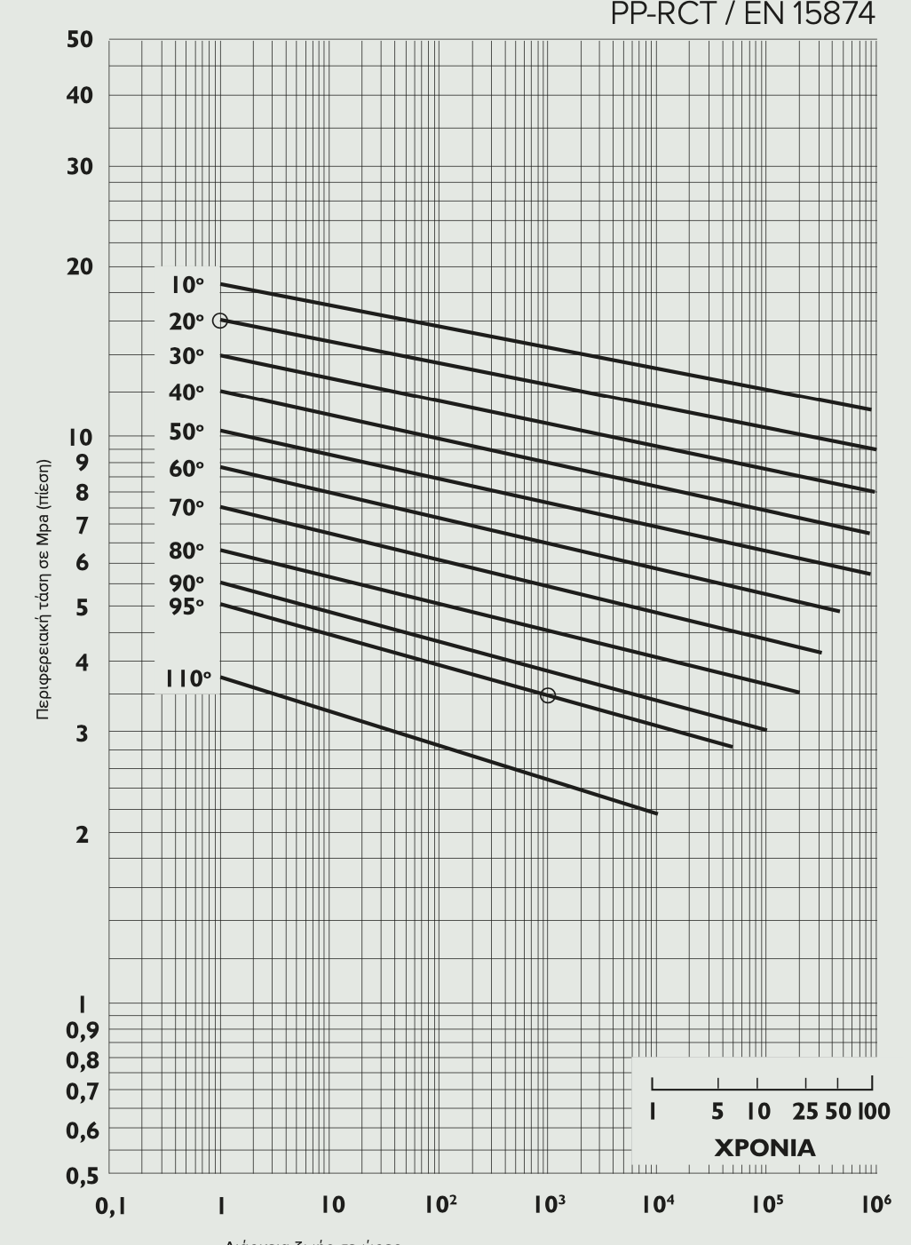 - To PP-RCT, σύμφωνα με τα Ευρωπαϊκά πρότυπα, δεν παρουσιάζει μετάβαση και αλλαγή κλίσης στα λογαριθμικά διαγράμματα υδραυλικών αντοχών, εξαιτίας της άριστης συμπεριφοράς που παρουσιάζει στη γήρανση.